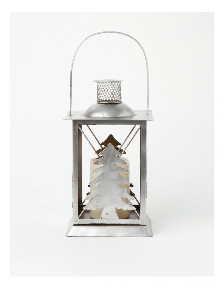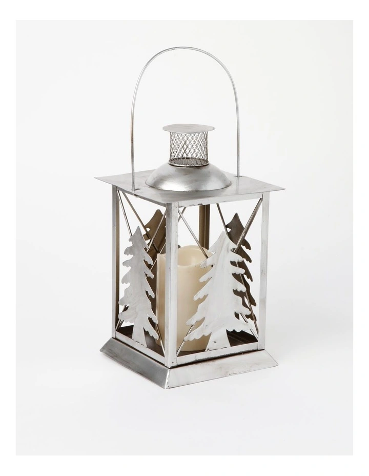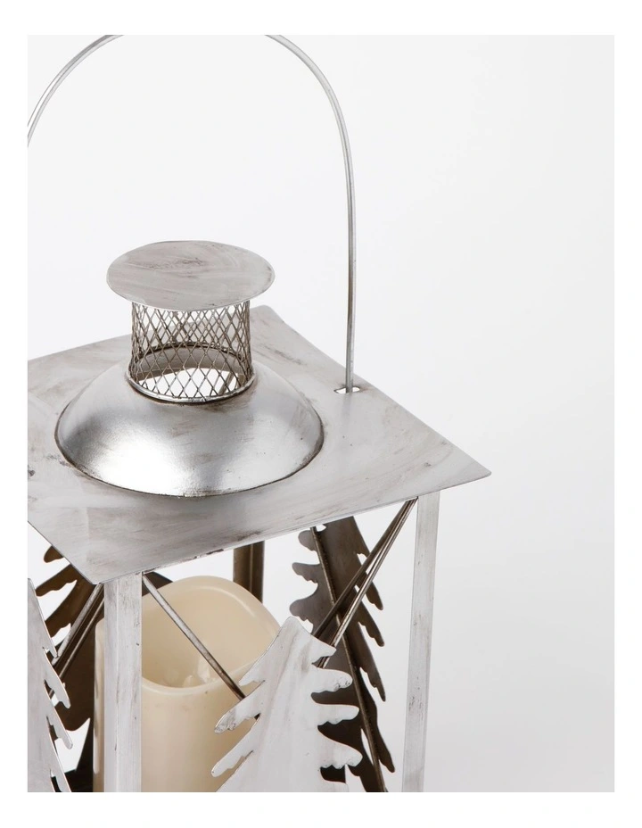Myer GiftoriumΒ Eucalyptus Metal LED Lantern with Tree Cut-out in Silver: 28 cm