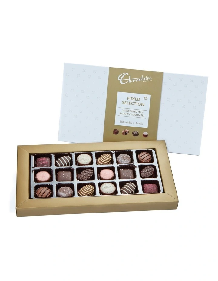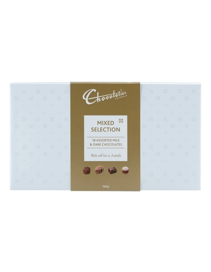 Chocolatier Australia 190g Gold Mixed Selection contains 18 delicious milk and dark chocolates. Flavours include salted caramel, tiramisu, raspberry ganache, strawberry delice and more. A beautiful gift or great addition to your Chocolate plate on Christmas day. Made with love in Australia by Chocolatier AustraliaΒ