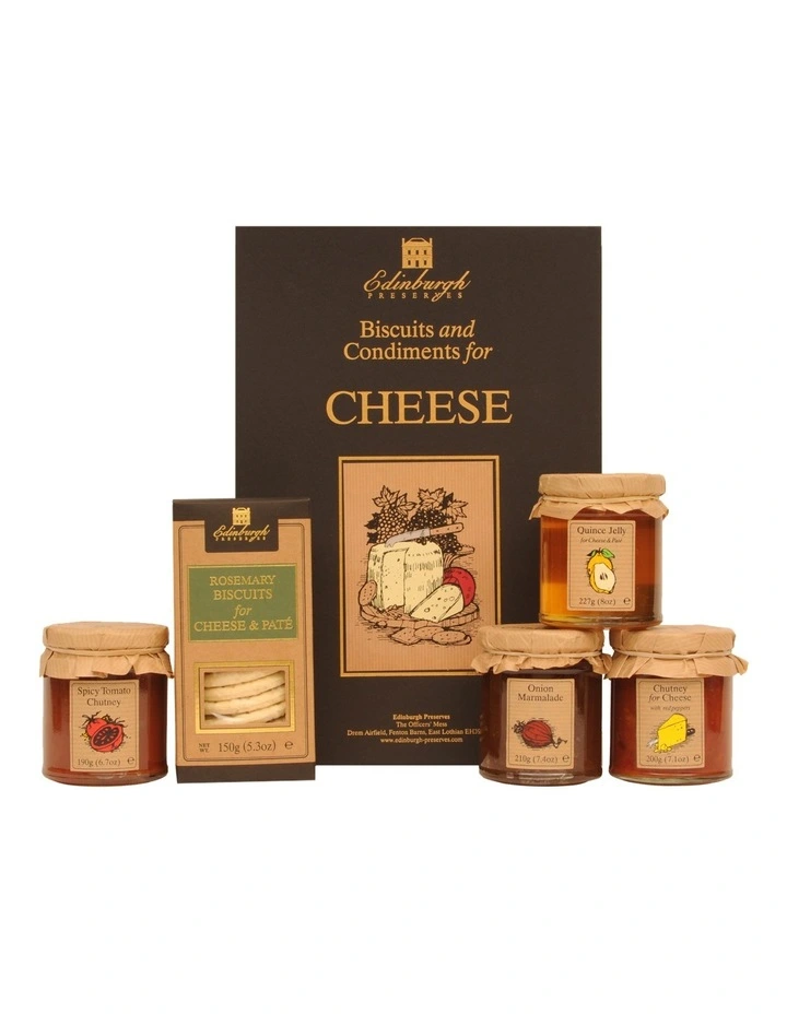 Product Ingredients: Quince Jelly 227g : Sugar, Quince Juice (from concentrate (30%), Gelling Agent (fruit pectin), Acidity Regulator (citric acid). Prepared with 30g of fruit per 100g. Sugar content 68g per 100g. Made in the UK. Onion Marmalade 210g: Onions (48%), Sugar, White Vinegar, Salt. Made in the UK. Chutney for Cheese 180g: Diced Onion (45%), Sugar, Spiced Vinegar (Malt Vinegar, Malt Extract, (both from Barley), Spices), Dates (Contains Rice Flour), Diced Bramley Apple, Dried Diced Apple (Both Apples Contain Preservative: Sodium Metabisulphite (Sulphites), Vegetable Oil: Rapeseed, Salt, Yellow Mustard Flour, Spice. Allergens are underlined. Made in the UK. Rosemary Biscuits 150g: Wheat Flour, Water, Margarine (palm and rapeseed oil, salt 2%, emulsifier, colourings, flavourings), Shortening (palm and rapeseed oil), Sugar, Sea Salt, Skylark (raising agent E450, wheat flour, salt), Ammonium, Sodium, Rosemary (1%). Allergens are underlined. Made in Scotland. Spicy Tomato Chutney 190g Tomatoes (55%), Onions, Brown Sugar, Malt Vinegar (from barley), Modified Maize Starch, Chillies (1%), Mustard (water, mustard (33%)), Spirit Vinegar, Sea Salt, Antioxidant: sodium bisulphite E222, Salt, Curry Powder. Allergens are underlined. Made in the UK