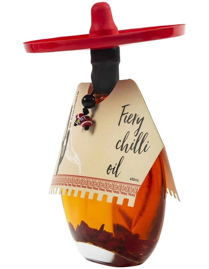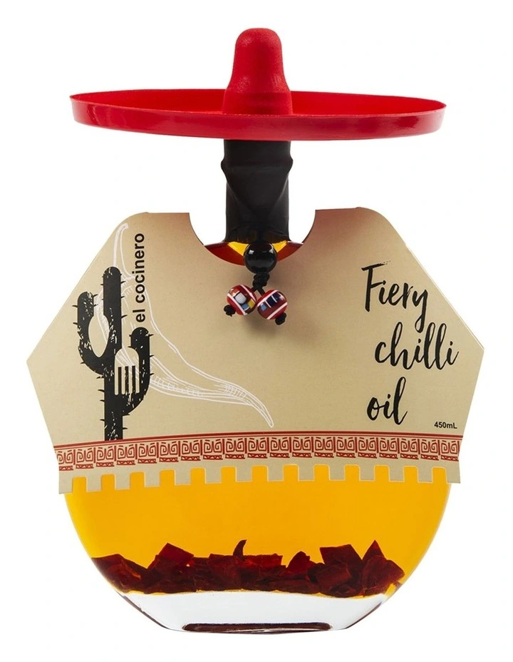 Hot Chilli Oil in large glass rounded jar and Mexican hat with aΒ resealable top.