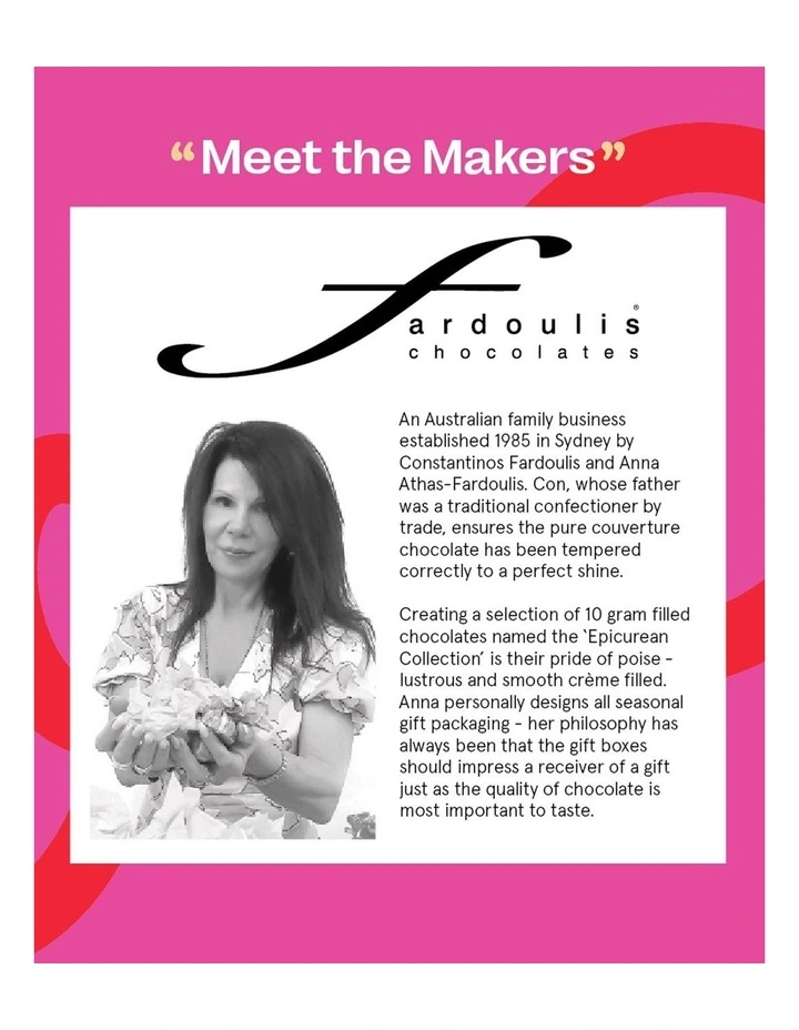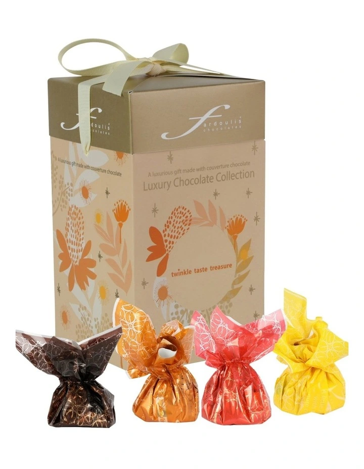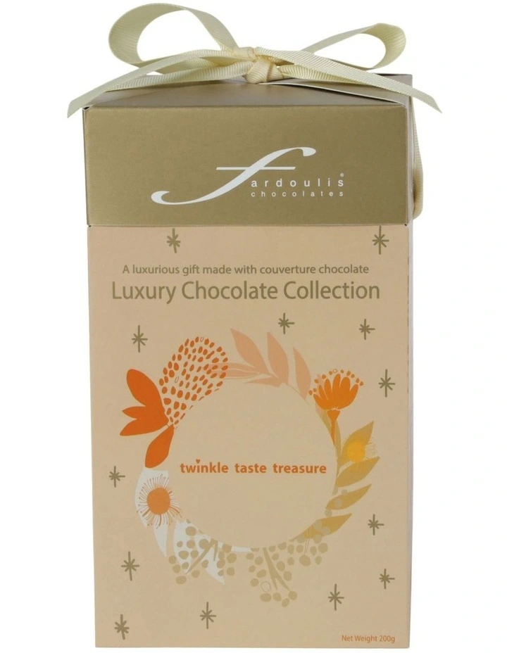 25 epicurean-shaped Assorted Flavours. Make someones Christmas very special this year with this gift from Fardoulis Chocolates. Featuring an assortment of Fardoulis famous couverture chocolates, the design of this gift box was inspired by champagne and the flowers of Christmas. A beautiful luxury chocolate gift for someone special in your life.