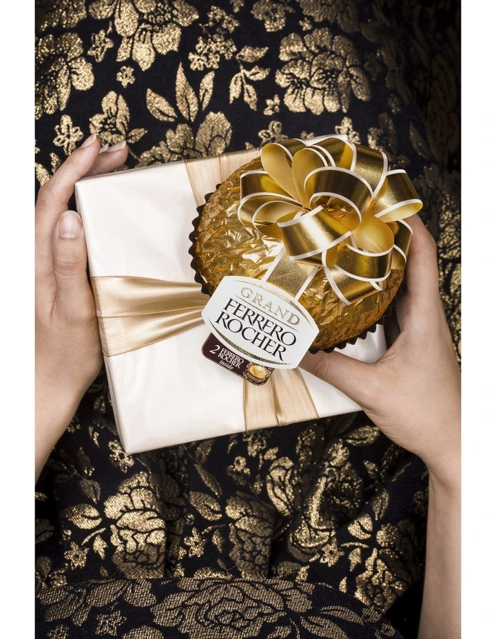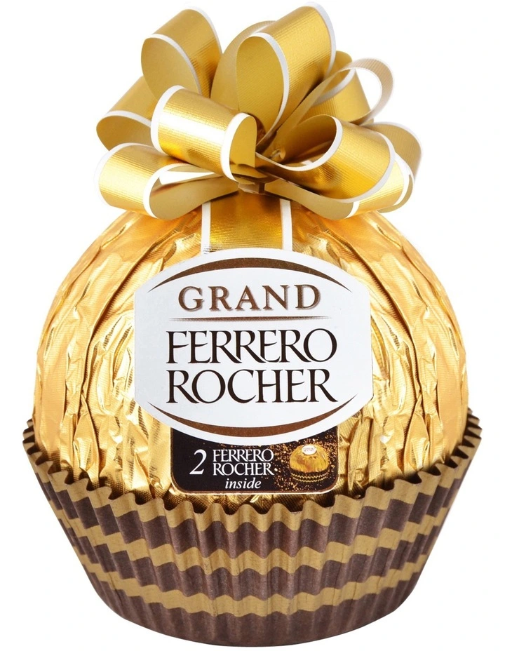 Ferrero Rocher Grand Rocher 125g. The Grand Ferrero Rocher 125g has a delicious milk chocolate hazelnut shell and contains 2 Ferrero Rocher inside.