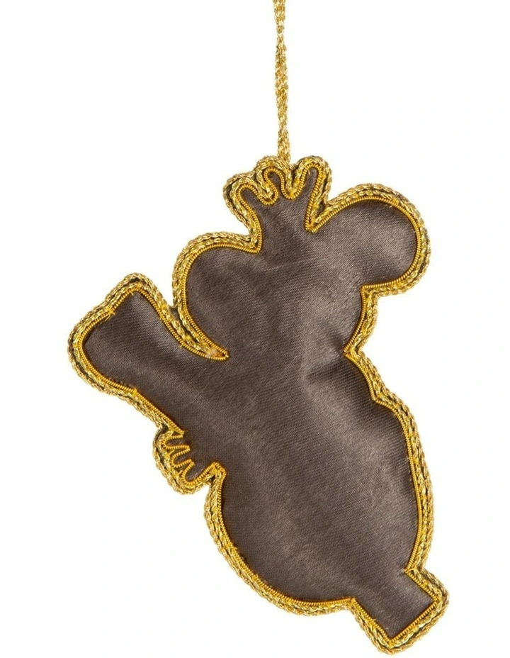 This adorable koala hanging decoration features beautiful glittery sequins in silver with different colours of fabric throughout. A gorgeous golden fabric trim all round it provides a perfect highlight. It is intricate and colourful, making it perfect for festive celebrations.