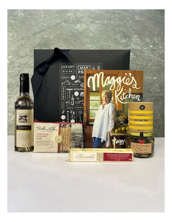 Product Ingredients: Ogilvie and Co. Antipasto Olives 200g Maggie Beer Verjuice 375ml Rinaldi Macadamia Nougat 86g Olssons Lemon Zest Salt Rub 140g Kraft Canister Maggie’s Kitchen by Maggie Beer Trentham Tucker Poppyseed & Sesame Lavosh 250g Stylishly presented in our Gourmet Basket Signature Gift Box finished with ribbon, tissue and gift card