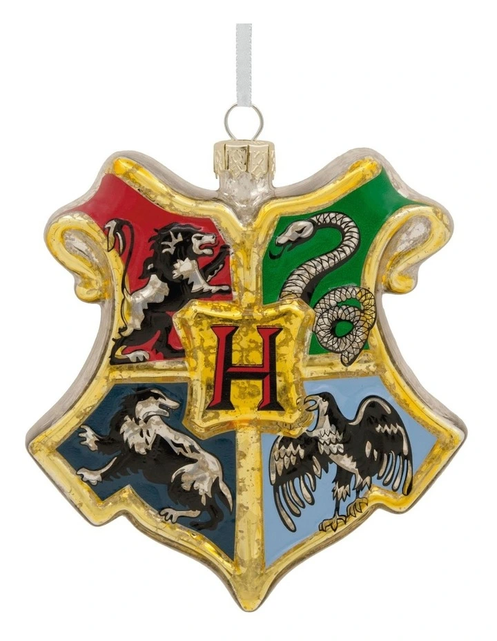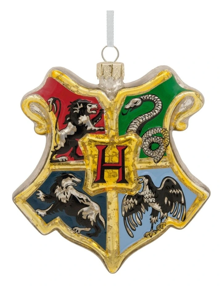 Adorn your Christmas tree with this glass ornament of the iconic Hogwarts School of Witchcraft and Wizardry coat of arms. Represents all four houses: Gryffindor, Ravenclaw, Hufflepuff and Slytherin.