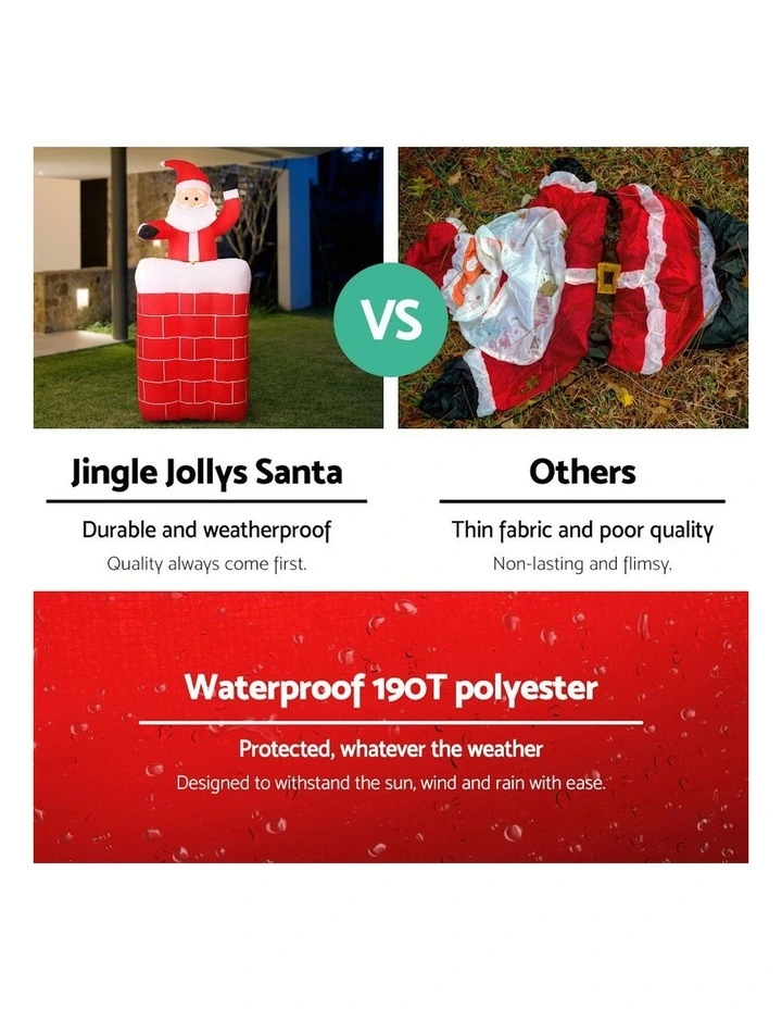 Surprise everyone and have more festive fun with the Jingle Jollys Inflatable Pop-up Santa in Chimney. Easy to set up and an awesome 1.8m attraction, our Santa goes up and down in quick succession to bring some unanticipated joy to all. Just plug the ensemble in and let the built-in fan inflate Santa and Chimney in minutes. Better still, the fan keeps Santa inflated throughout with its constant air supply. The entire inflatable is made of water-repellent 190T polyester and UV-resistant for durability. And to add more brilliant cheer, two cool white LEDs are also built-in for a vibrant night-time display together with your Christmas dcor. Your purchase comes with everything you need for an easy set-up while storing it is hassle-free with its fast deflate and fold away feature. Perfect for indoor or outdoor use, the Jingle Jollys Pop-up Santa in Chimney will certainly perk up your Christmas in more ways than one. Get yours today.