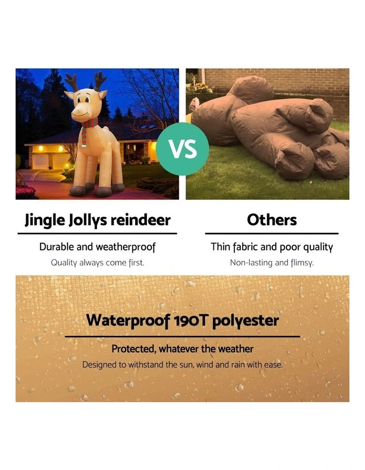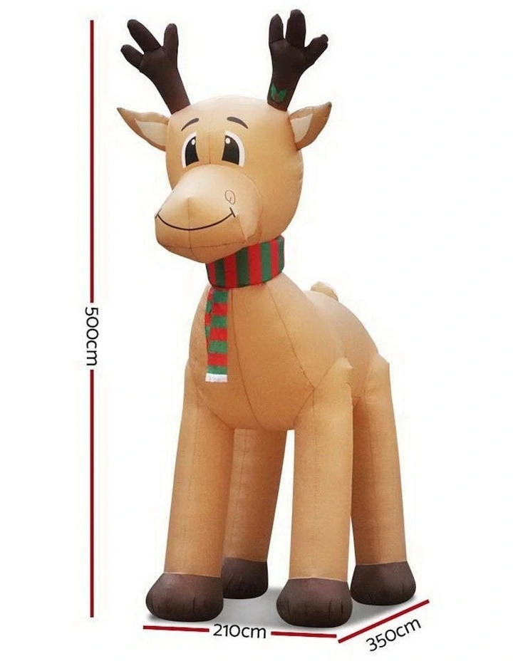 Make this Christmas a really big one! With the Jingle Jollys Giant Reindeer Inflatable. This awesome inflatable towers 5m in height and is a spectacular sight from near or far. Its smiling face certainly brings a bunch of good cheer to one and all and the five built-in LED lights also help to illuminate its massive presence day and night. Made of water-repellent 190T polyester and UV-resistant for durability, the Giant Reindeer Inflatable is inflated by two built-in fans for ease of set-up. Also included are pegs and ropes to keep the entire ensemble firmly in place. Installed the Jingle Jollys Giant Reindeer Inflatable as part of your festive dcor at home or at the shop and it will definitely bring wonderful attention to its towering joy. Get yours today.