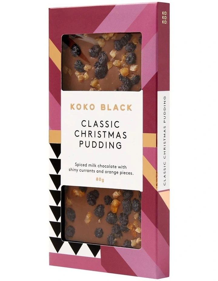 Koko Black combines all the flavours of a traditional Christmas pudding in a creamy Belgian milk chocolate block to make this the most delicious way to celebrate the season.