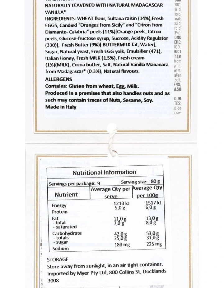 Product Ingredients: INGREDIENTS: WHEAT flour, Sultana raisin (14%), Fresh EGGS, Candied Oranges from Sicily and Citron from Diamante- Calabria peels (10%) [Orange peels (54%), Citron peels (54%), Glucose-fructose syrup, Sugar, Concentrate lemon juice], Fresh Butter (9%) (MILK), Sugar, Natural sourdough yeast (GLUTEN), Fresh EGG yolk, Emulsifier: mono- and fatty acid diglycerides of vegetable origin, Italian Honey, High quality fresh MILK (1%), Fresh cream (1%) (MILK), Cocoa butter, Cervia whole marine salt, Natural Vanilla Mananara from Madagascar* (0,2%), Natural flavours. FOR ALLERGENS, INCLUDING CEREALS CONTAINING GLUTEN, SEE INGREDIENTS IN BOLD. MAY ALSO CONTAIN: NUTS, SOYA. MADE IN ITALY. *SLOW FOOD PRESIDIUM.