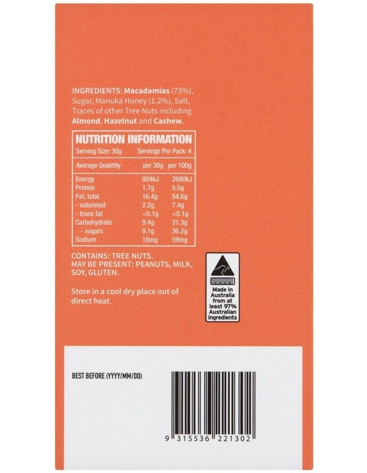 Product Ingredients: Macadamias (73%), Sugar, Manuka Honey (1.2%), Salt, Traces of other Tree Nuts including Almond, Hazelnut and Cashew.