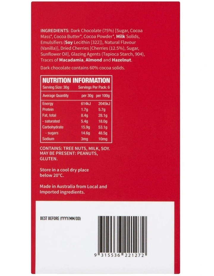 Product Ingredients: Dark Chocolate (75%) [Sugar, Cocoa Mass, Cocoa Butter, Cocoa Powder, Milk Solids Emulsifiers (Soy Lecithin [322])), Natural Flavour (Vanilla), Dried Cherries [Cherries (12.5%), Sugar, Sunflower Oil], Glazing Agents (Tapioca Starch, 904), Traces of Macadamia, Almond, Hazelnut and Peanuts.Dark Chocolate contains a minimum Cocoa Solids 55%.CONTAINS: TREE NUTS, MILK, SOY, PEANUTS.MAY BE PRESENT: GLUTEN